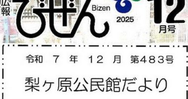広報びぜん12月号と梨ケ原公民館だより12月号が届きました。管理事務所入ってすぐ左側のカウンターに置いていますので、ご自由にお持…
