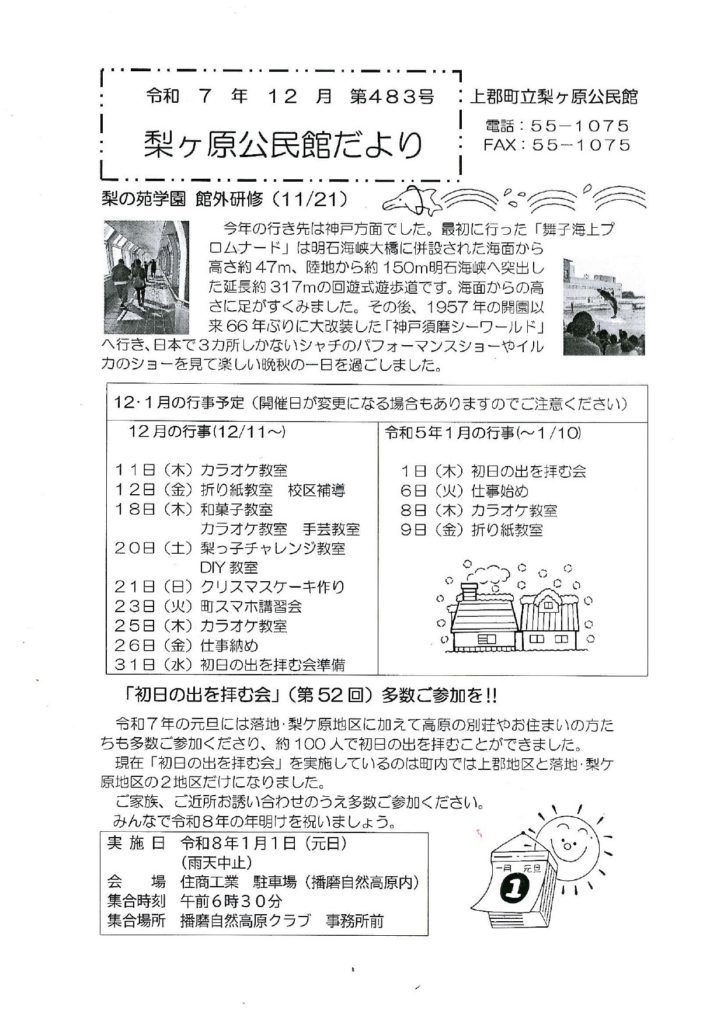 広報びぜん12月号,梨ケ原公民館だより12月号が届きました。 2025.12.8 広報びぜん12月号と梨ケ原公民館だより12月号が届きました。 管理事務所入ってすぐ左側のカウンターに置いていますので、 ご自由にお持ち帰りくださいませ! 山の家カフェ「結いの里」よりお知らせ前の記事 【重要】不審な郵便物にご注意ください~盗…次の記事